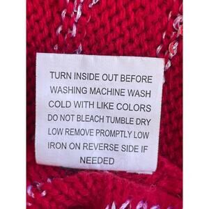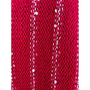 Ladies sparkly Red sweater great for holidays or layering in winter. Red sweater in Medium size has an oversized fit. round pullover neckline, 3/4 long sleeves with wide openings, looks much like a Dolman sleeve fit. Silver sequins adorn the red in a stripe design. hand tied fringe pieces edge the bottom hem all over.