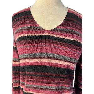 Large purple striped Valerie Stevens sweater with long sleeves, V-neck, and a slight stretch. Notable for its extra fine Marina wool. FLAW Small hole in left arm and shoulder. Made in Hong Kong. Dry clean only.