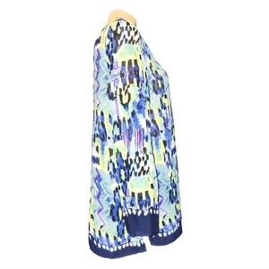 Valerie Stevens Sheer Blue & Green Beaded V-Neck Long Sleeve Tunic Size L. Cool and ready for wear, this 100% polyester tunic only needs your matching cami and you've got your next favorite look. The colors of blues and greens on crisp white with a bit of yellow added put you in mind of coastal waters and sandy beaches. This top is preowned with light wear and no major flaws noted. Approximate measurements lying flat: armpit to armpit 22", length from collar to bottom hem 31".
