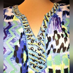 Valerie Stevens Sheer Blue & Green Beaded V-Neck Long Sleeve Tunic Size L
