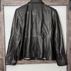 Sleek and stylish black 100% lamb leather jacket. Features a classic design with a modern touch. Ideal for versatile wear. Item is preowned and in excellent/like new condition. It is a women's medium. It features shoulder pads and pockets on both sides.