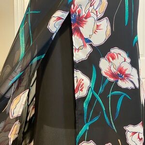Black lining with sheer overlay with large print floral pattern in shades of green, pink, and tan.