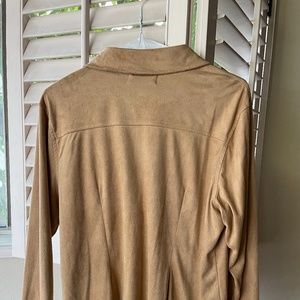 This is a suede like long sleeve button up casual blouse . size is medium in new condition. The color is a light Tan 100% polyester . New never wore but no tag's.