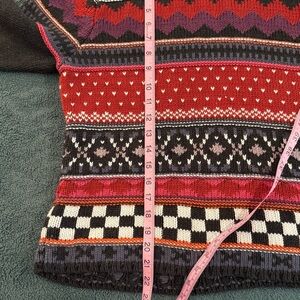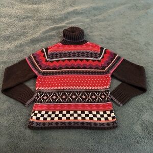 Vibrant turtleneck with intricate patterns. Features red, black, and purple tones. Ideal for a chic, cozy style.