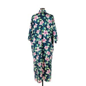 The Valerie Stevens Vintage Half Zip Up Muumuu Caftan in size XL is a stunning statement piece that blends comfort and retro charm. Crafted from smooth polyester satin, this long maxi caftan showcases a vibrant multicolor floral pattern that captures timeless vintage elegance. The half zip front closure adds convenience and style, while the side pockets enhance practicality for everyday wear. Perfect for lounging or casual outings, this Valerie Stevens caftan offers a relaxed, flowy fit that flatters all body types. A must-have for collectors of vintage loungewear and lovers of bold, colorful prints.