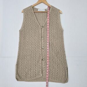Elevate your layering game with this chic Valerie Stevens sleeveless cardigan vest. Crafted from a lightweight linen and cotton knit blend, this longline vest features an openwork textured pattern, button front closure, and a neutral beige hue that makes it a versatile piece for year-round wear. The sleeveless design is perfect for layering over blouses, tees, or dresses, adding both texture and style to your look. A timeless wardrobe staple that transitions effortlessly from casual weekends to polished office outfits.