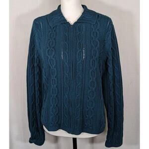 Last 3 photos are lightened to show detail better.This Valerie Stevens sweater jacket is a stylish addition to any woman's wardrobe. With a classic cable-knit style and full zipper, it's perfect for any casual occasion. The collar and long sleeves add a touch of sophistication, while the teal /hunter green color scheme is perfect for any season.