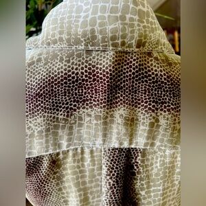 Valerie Stevens Vintage long sleeve lightweight, snakeskin pattern blouse, excellent condition, two front pockets, green and brown coloring