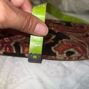 Exterior fabric, front has beading (no missing beading), gold tone hardware, clasp closure, inside fabric lining, inside zipper pocket, and one open pocket, detachable chain straps.