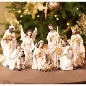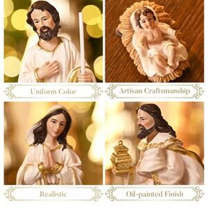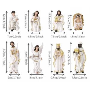 •This 8-piece nativity set includes all the essential figures for a traditional Christmas display: the Holy Family, the Three Wise Men, a shepherd, an angel, and Baby Jesus. It offers a comprehensive and authentic representation of the nativity scene