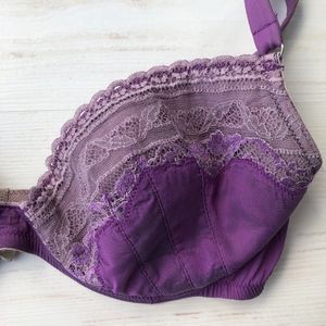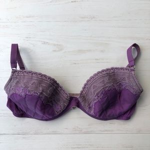 This is a Valery underwire bra in good used condition. Valery is a higher end Italian brand I believe. The silk has a luminescent quality, and the lace has some piling. There is discoloring on the last two hooks on the strap. This bra has seen some wear, but definitely has more life left! The size is a 38C.