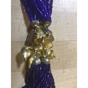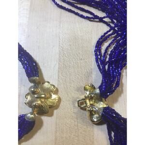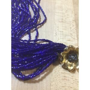 Gorgeous vintage multi strand necklace. Cobalt blue shimmering seed bead long necklace with flower hook clasp. This beautiful statement piece is elegant and classy. At 24” long, not need for a extender. There is some tarnish on the clasp connectors “shown on the picture”. Unmarked. Possible Valjean.