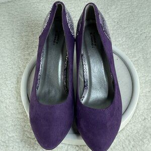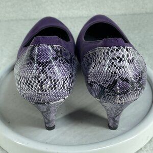 These Valley Lane Heels in Women's size 8M are purple faux suede uppers with animal print heels feature a pointed toe and a heel height of 2.5 inches. They have cushioned insoles and in excellent condition. The soles are cloth and show virtually no wear. See the photos for details.