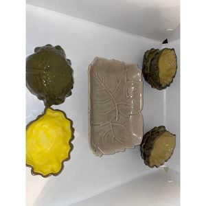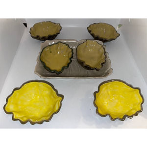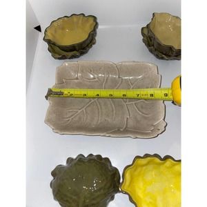 6 smaller bowls for dips/nuts. The smaller bowls are shaped like leaves and vary in color-light yellow