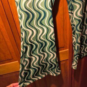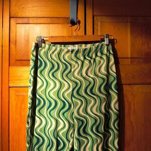 Super groovy 70's style pants. The print is very fun and the flare leg/high waisted cut is very flattering. These were my dancing pants for a while, but it's time they found a new home. Definitely stretchy making them very comfy and great to get your boogie on! Great condition. I only wore them on special occasions like parties or festivals.
