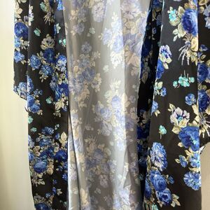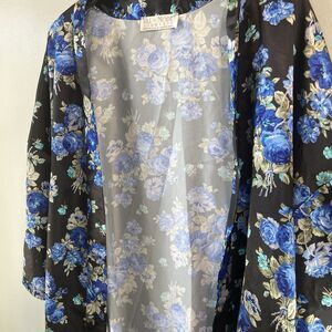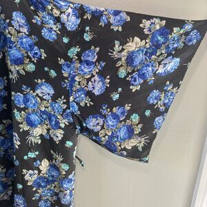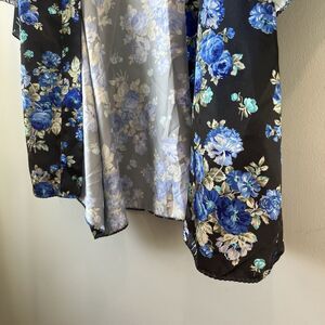 Val-mode Lingerie Black with blue florals satin kimono Robe, size Large