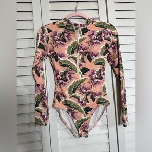 Embrace elegance with this floral long sleeve swimsuit. Perfect for a stylish day at the beach.