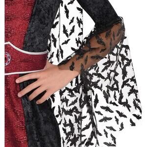 Get ready to unleash your inner vampire with this stunning dress from Halloween. This black and red polyester dress features bat wings on the sleeves, a belt to cinch the waist, and a fancy velvet fabric that adds a touch of royalty to the look. Perfect for any Halloween or theater production, this dress is sure to make a statement.