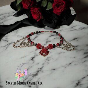 This gorgeous choker is handbeaded with glass and garnet chip beads for that gorgeous vamptress of the night. Seductive and alluring she draws you In for another bite. Choker measures at 19 inches and can be adjusted to 24 inches. Chains are made from stainless steel. The bat charm is alloy and resin. Roses are made from resin
