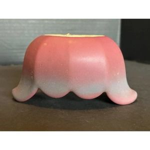The oblong, short, canoe/tulip shaped vase begins at the base in a bright, but deep mulberry, slowly lightening to a pink, with grey/silver/blue tips on the tulip's "petals". Matte outer vase, shiny inner shell.