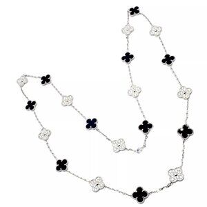 The Van Cleef & Arpels 18k White Gold 20 Motif Alhambra Necklace features the iconic clover-inspired design, adorned with alternating black onyx and sparkling diamond motifs.