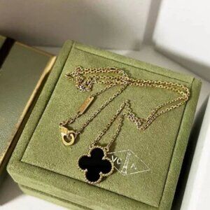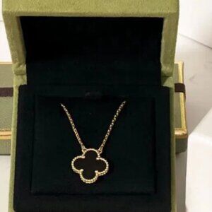 Elegant necklace featuring a black clover pendant. Gold chain adds a luxurious touch. Perfect for any occasion.