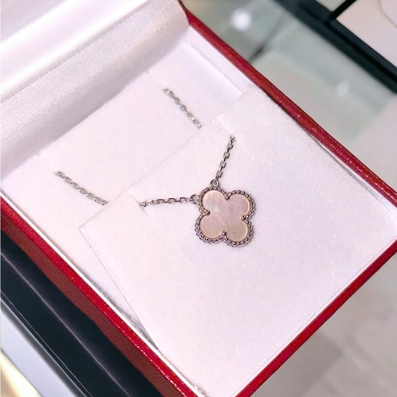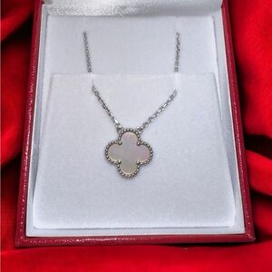 18 karat Van Cleef & Arpels silver pendant featuring a mother-of-pearl Alhambra motif in a scalloped frame. Authentic, no flaws, comes with box.