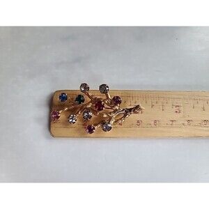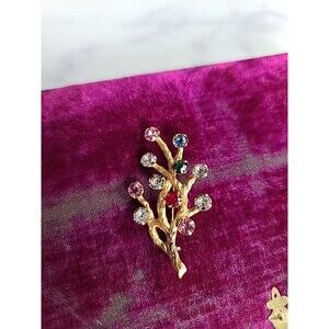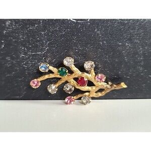 This is a vintage Van Dell 12K yellow gold filled branch shaped brooch with different colored prong set rhinestones.