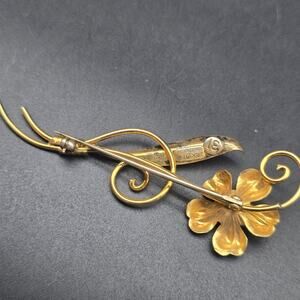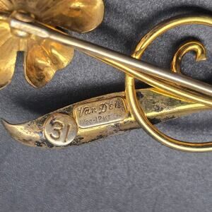 This vintage Van Dell 12K gold filled brooch features a 2.5" x 1" W flower with a blue rhinestone center