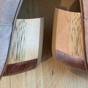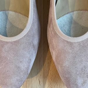 "Nude" suede with subtle sparkle - all leather with unique heels. Striking style, well made, and versitile. 1.25" heel.