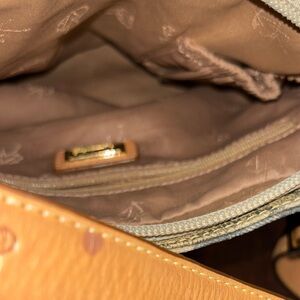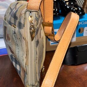 Stylish leather handbag with Van Gogh design. Features a tan leather strap and artistic print.