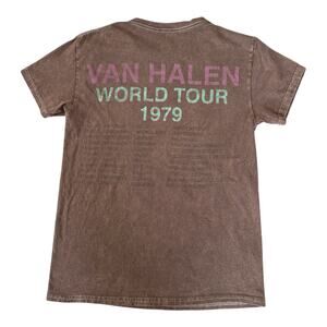 Van Halen 1979 Tour reprint T-shirt in a soft brown vintage-wash style. Features a bold graphic front with the 1979 tour globe and a full double-sided back print listing the World Tour cities. Modern licensed reprint with printed tag. Comfortable 100% cotton. Perfect for classic rock fans, collectors, or everyday casual outfits.