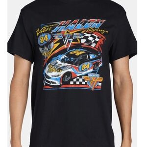 Black t-shirt featuring a vibrant Van Halen racing graphic. Perfect for fans and casual wear.