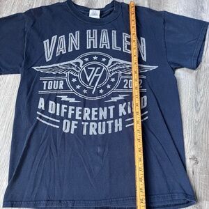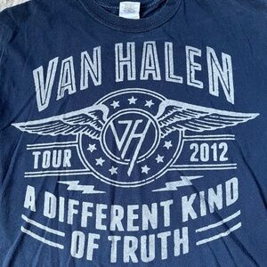 Navy blue Van Halen 2012 tour t-shirt with white graphics. Features 'A Different Kind of Truth' design. Mens Size mediumGildan tee. Made of 100% Cotton. Tour cities on the back