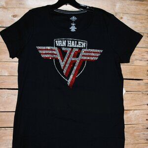 Custom made to order Van Halen rhinestone bling black round neck tshirt. This shirt features a large Van Halen design with 1000's of sparkling vivid red, jet black and diamond clear rhinestones. Great concert shirt or just a great way to celebrate the amazing group Van Halen.