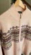 The sweater has a pale pink background color with patterns in grey, light and dark green, brown and burgundy colors.