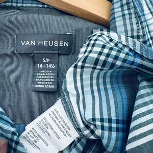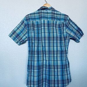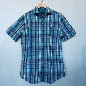 Men’s size Small Van Heusen blue plaid print pattern button down short sleeve casual dress shirt. Excellent like new condition, very lightweight. Clean nonsmoking home. Approx 21" pit to pit across chest, 17" pit to lower hem side length.