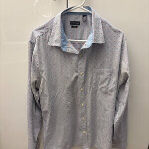 The Van Heusen Button Down Shirt in size L 16-16 1/2 features a stylish polka dot pattern, long sleeves, and a slim fit for a modern look. Made from a comfortable cotton blend material with stretch, this dress shirt is designed for a regular fit with a button-down collar. Perfect for a polished professional or dressy casual occasion, this shirt is a versatile addition to any man's wardrobe. Made by the reputable brand Van Heusen, this shirt is sure to provide both style and quality for the wearer.