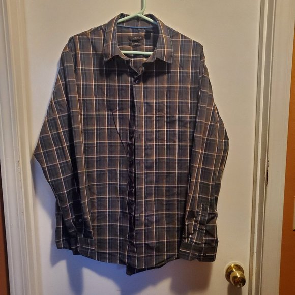 Really nice, soft, relaxed Van Heusen plaid button down shirt. Brown, blue, and white in color. Mens large.