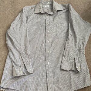 Timeless striped button-up shirt by Van Heusen. Features a lightweight cotton blend, button front closure, chest pocket, and crisp collar. Grey and white vertical stripes make it a versatile piece — perfect for work, business casual outfits, or styled oversized with jeans for a more relaxed look. See photos for details.