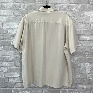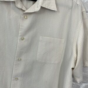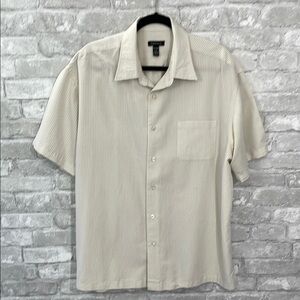 This Van Heusen shirt in a soft cream color is perfect for a relaxed, casual look. Its lightweight fabric and classic collar make it ideal for warm weather. The subtle vertical texture adds a touch of sophistication to this versatile piece.