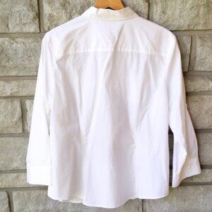 A crisp white button down. blouse from the brand Van Heusen. New with tags! Two front pockets from some added interest, but otherwise just a 'wardrobe basic' top. Excellent condition; however a bit dusty from storage and there is some sort of blemish near the bottom button. Unsure if it is permanent or could be easily lifted out.