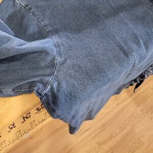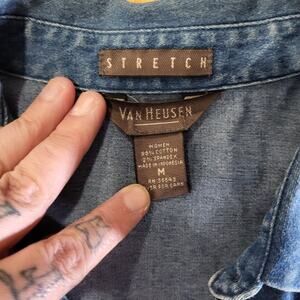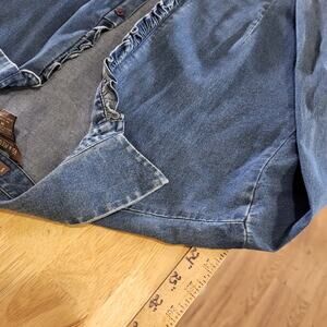 This Van Heusen button-down shirt blends classic denim with a feminine twist, featuring soft cotton fabric, a pointed collar, and subtle ruffle details along the placket. Designed with medium stretch for comfort and a flattering fit. Pre-owned and in excellent condition with no visible wear. Ideal for coastal cowgirl, boho western, or everyday casual styling.