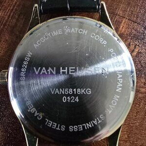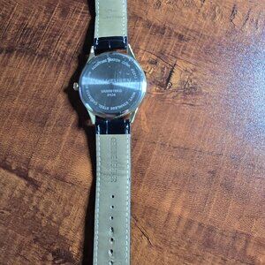 Van Heusen diamond watch. 44mm gold tone case with black dial, diamonds at 12 and 6. Black leather strap with gold buckle. New battery. Watch has signs of being worn but still in very good condition