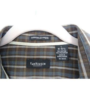 Mens Van Heusen Dress Shirt Button Up Size Large 16 -16 1/2 Brown Plaid with blue pin stripes Long Sleeve Great Condition