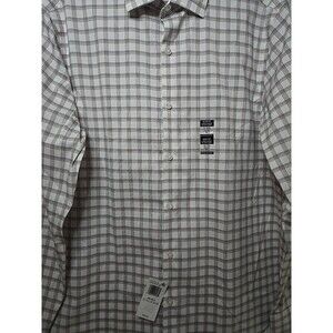 The Van Heusen Dress Shirt in size medium with a slim fit features a stylish plaid pattern in vibrant multicolor, perfect for adding a pop of color to any outfit. The shirt is made of a comfortable blend of polyester, cotton, and elastane, making it a versatile piece for any wardrobe. With a classic collared neckline and button closure, this shirt is both stylish and practical, fitting for a variety of occasions. The slimming fit and spread collar style add a modern touch, while the barrel cuff top accentuates the overall look. Perfect for men looking for a versatile dress shirt option.