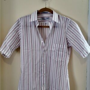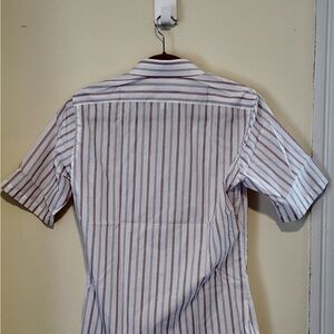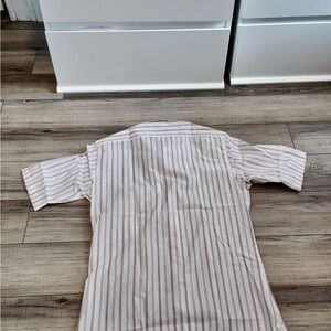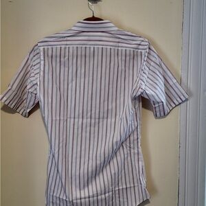 Stylish short sleeve button-up shirt with stripes. Features a classic collar and front pocket. Perfect for casual wear. Classic and versatile, this Van Heusen Editions men’s half-sleeve shirt features a crisp white base with subtle stripes for a polished look. Designed with a single-needle stitch for durability and a tailored fit, this pre-owned shirt is perfect for both professional and casual settings.