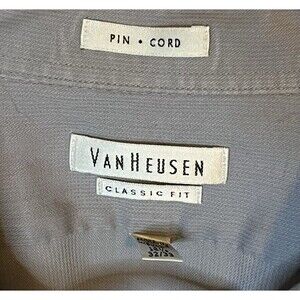 1 pre owned Van Heusen Mens Size Large Pin Cord Classic Fit Light Gray Long Sleeve Button Down Dress Shirt. Excellent condition with little signs of wear. Neck size is 16.5. Sleeve length is 32-33 in.