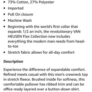 Van Heusen flex collection. Navy blue super soft material. You’ll be able to feel the difference in this expandable fabric. Redefined meets casual in this men’s crewneck top with stretch fleece. Brushed inside for softness. Can easily go from soft comfortable sweatshirt to office ready with a layered button down top.