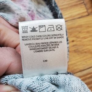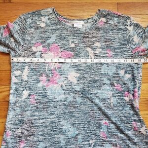 Stylish 3/4 sleeve top with a floral pattern. Features pink and blue flowers on a gray background.